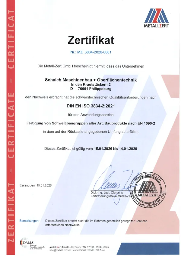 • DIN EN ISO 3834-2: Nachweis über umfassende qualitätstechnische Anforderungen für das Schmelzschweißen.