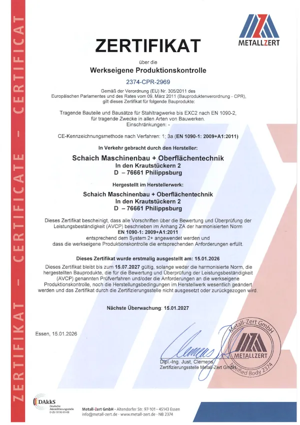 • EN 1090-2: Zertifizierte werkseigene Produktionskontrolle für die fachgerechte Ausführung von Stahltragwerken.